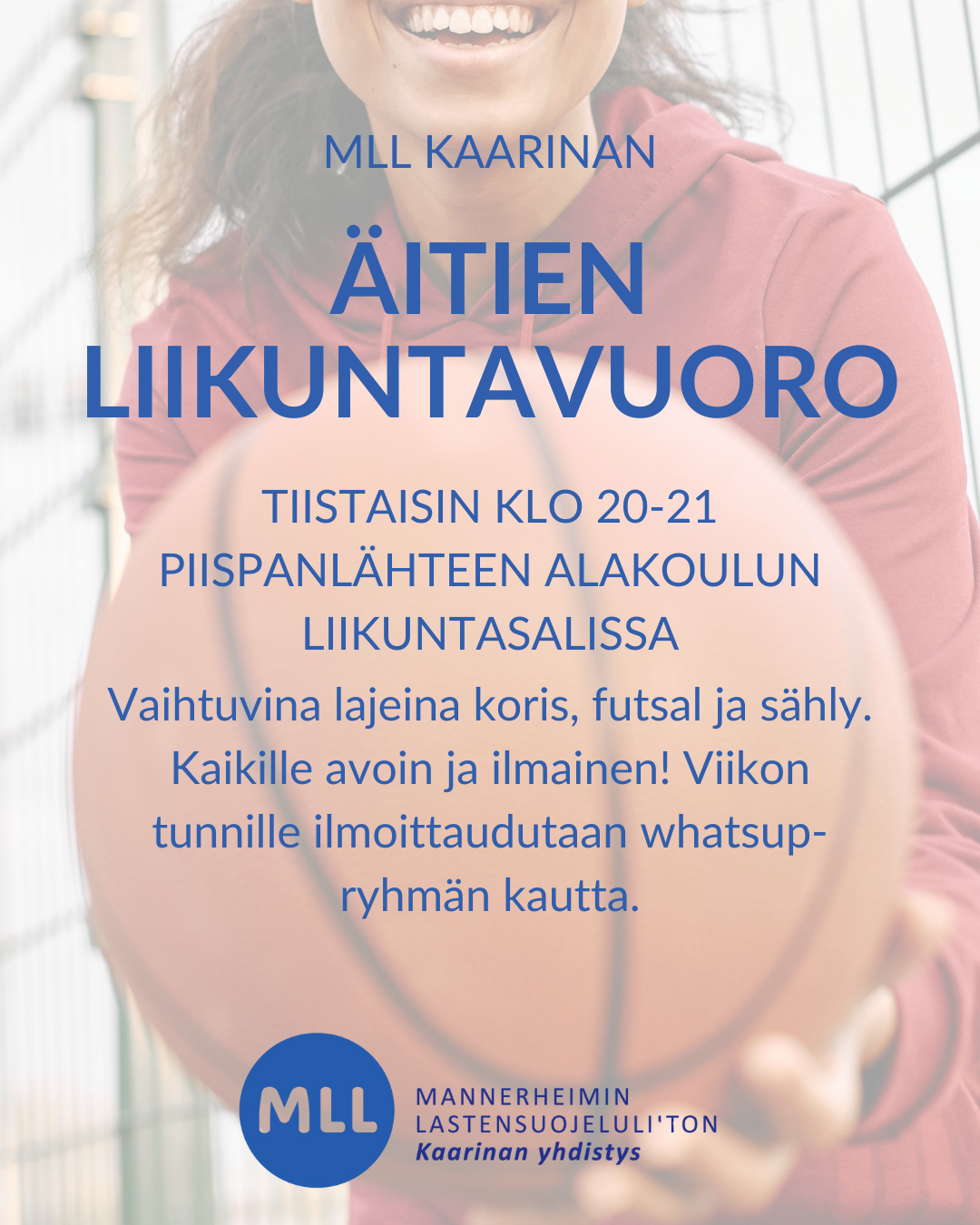 Tule mukaan rentoon, maksuttomaan MLL Kaarinan äitien palloiluporukkaan. Saat hikeä pintaan eri palloilulajien muodossa Piispanlähteen alakoulun liikuntasalissa (Otsonkatu 2) tiistaisin klo 20-21.…