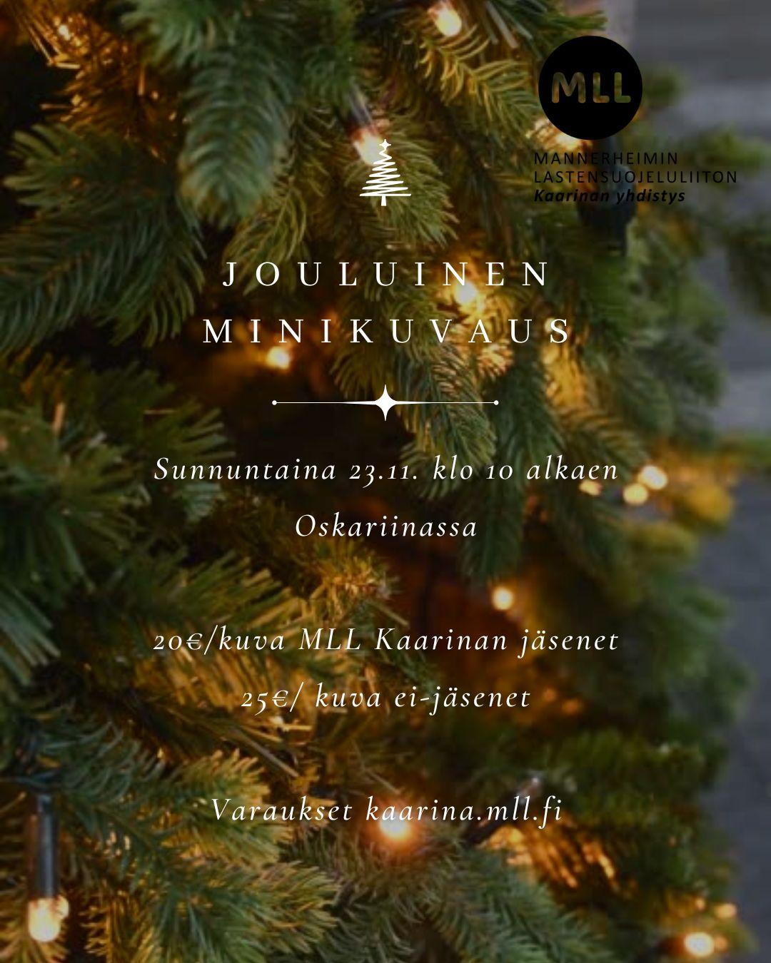 Jouluinen minikuvaus sunnuntaina 23.11. klo 10.00 alkaen Perhetalo Oskariinassa osoitteessa Lautakunnankatu 8. Hinnat: Itse kuvaus on ilmainen, maksat tilatuista kuvista seuraavasti: MLL Kaarinan…