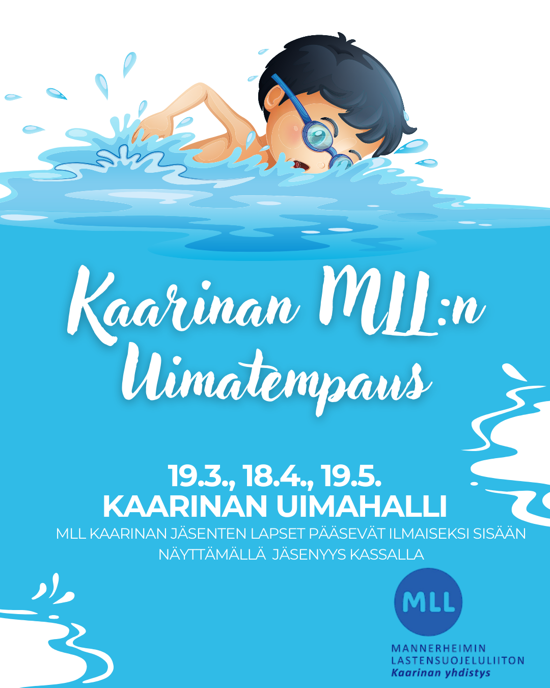 🌊💙 Kaarinan MLL:n uimatempaus 💙🌊 Tule mukaan koko perheen voimin vahvistamaan lasten uimataitoa ja viettämään mukava päivä yhdessä! Meille on tärkeää, että jokaisella lapsella on mahdollisuus…