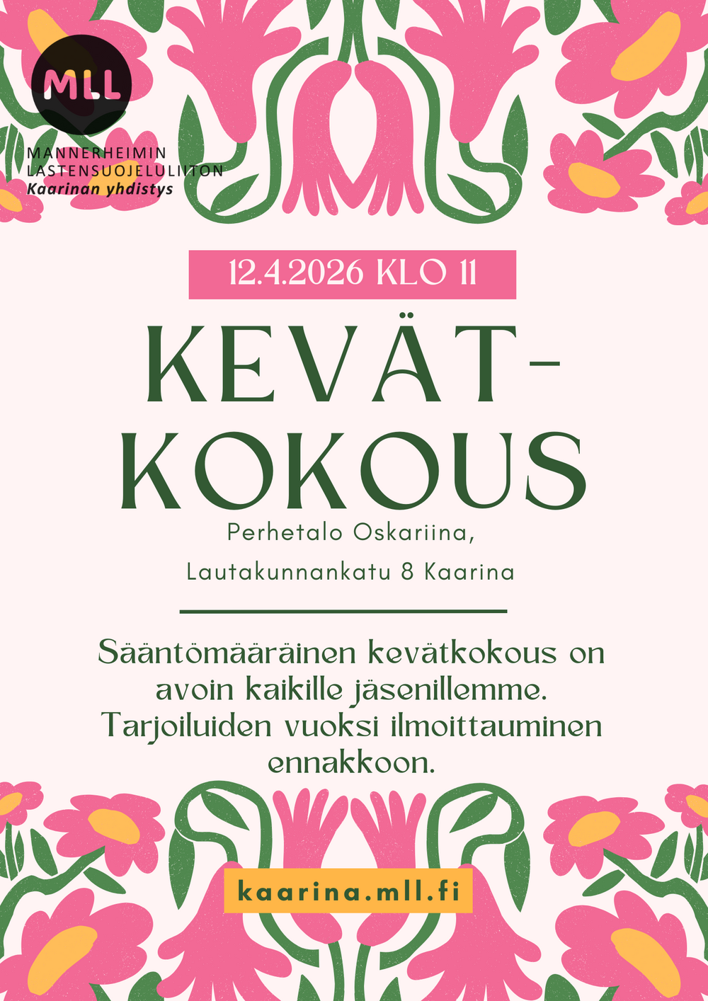 MLL Kaarinan paikallisyhdistyksen sääntömääräinen kevätkokous pidetään sunnuntaina 12.4.2026 klo 11.00 Perhetalo Oskariinassa. Yhdistyksen kevät- ja syyskokoukset ovat avoimia kaikille jäsenillemme,…
