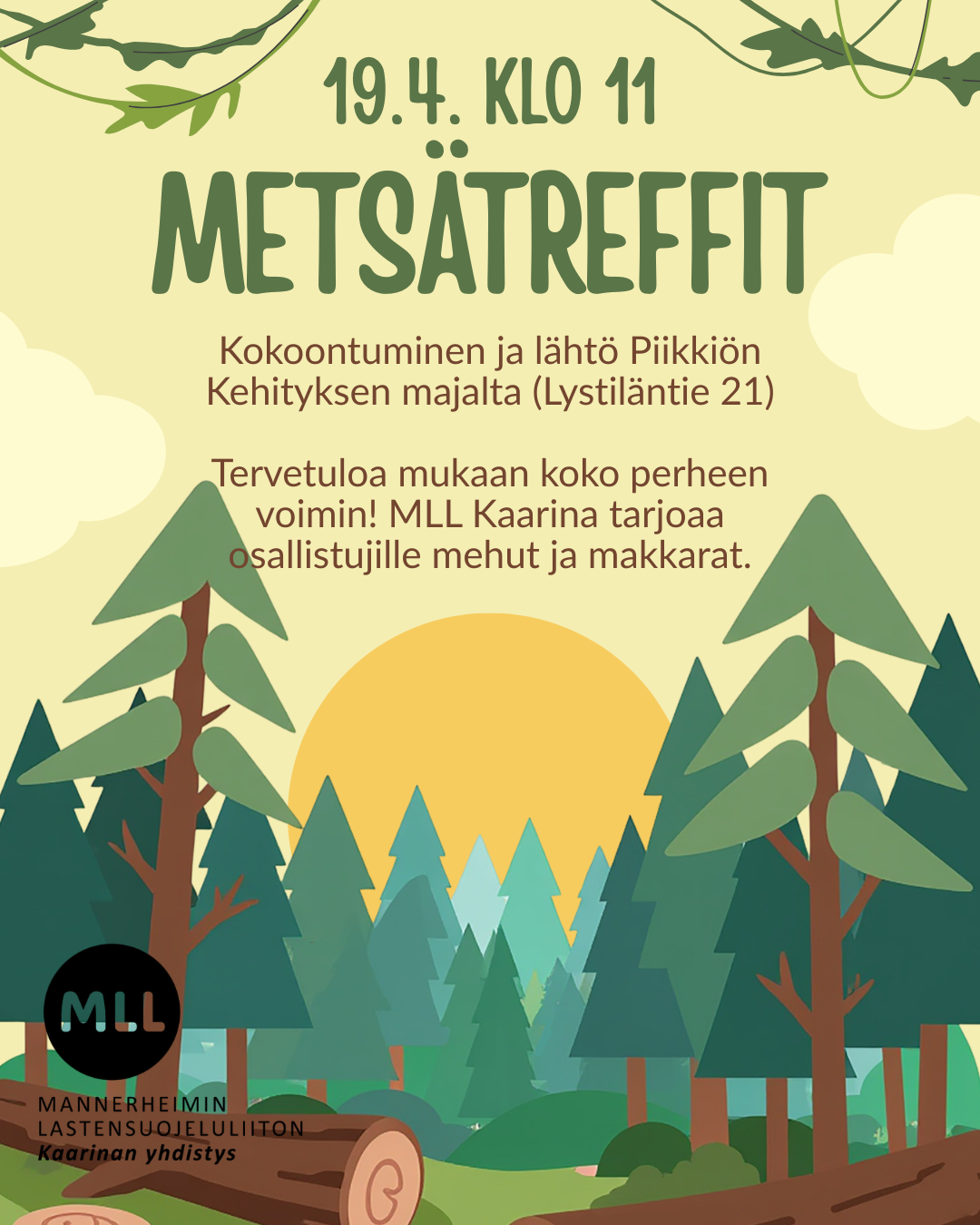 Tervetuloa mukaan vuoden ensimmäisille metsätreffeille! Kokoonnumme Piikkiön Kehityksen majalle (Lystiläntie 21) sunnuntaina 19.4. klo 11 ja suuntaamme yhteiselle retkelle keväiselle Linnavuorelle.…