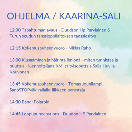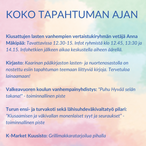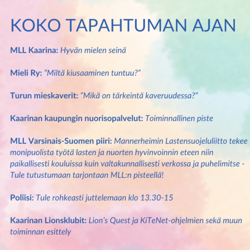 Tule lauantaina 7.10 Kaarina-talolle koko perheen voimin keskustelemaan, oppimaan ja kuulemaan asiantuntijoita kiusaamiseen liittyen.